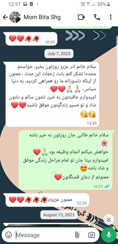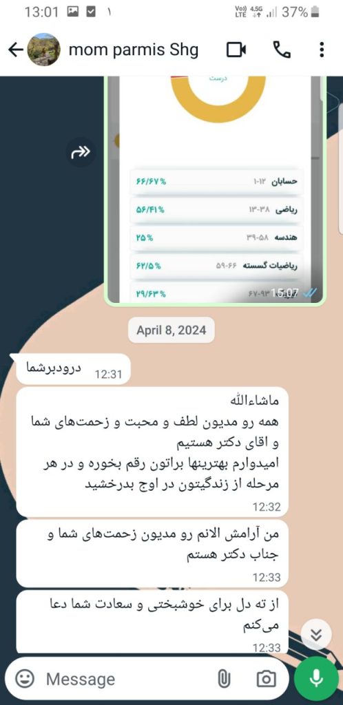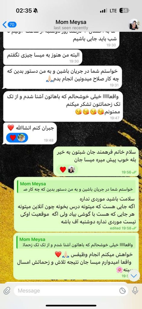 خانم طالبی، مادر بیتا خداپرست شاگرد ۱۴۰۲ و ۱۴۰۳ مشاوره و پانسیون